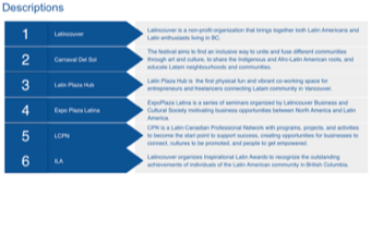I suggested organization descriptions for Latincouver, Carnaval Del Sol, Latin Plaza Hub, Expo Plaza Latina, LCPN, and ILA.