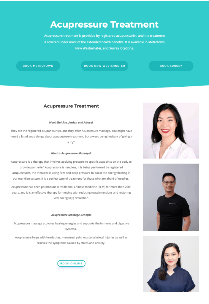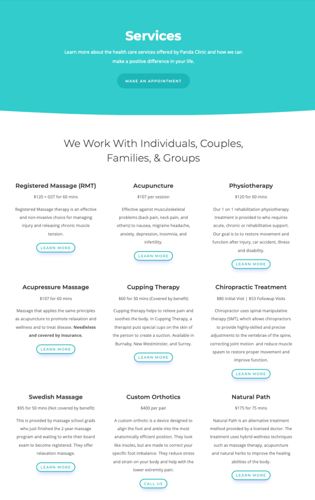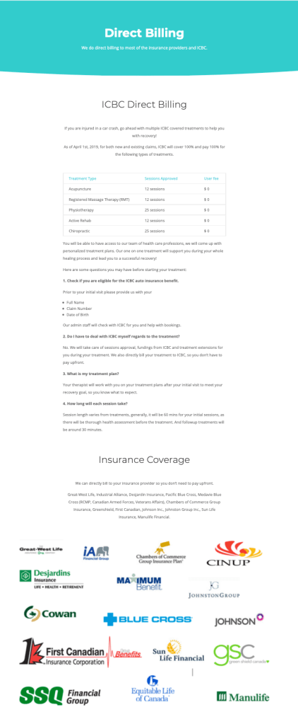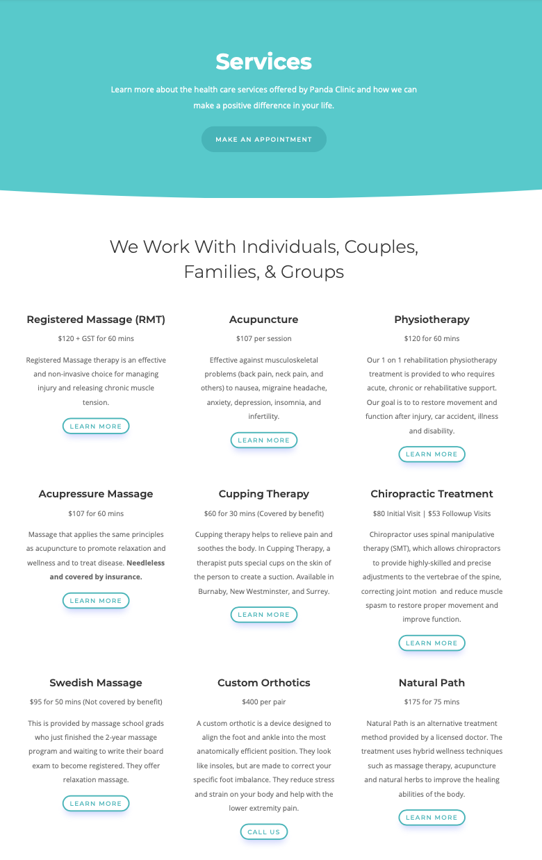I wrote Search Engine friendly content for the Panda Clinic’s services, registered massage therapy (RMT), acupuncture, physiotherapy, acupressure treatment, Swedish massage, chiropractic, natural path, direct billing webpages.